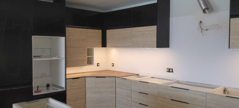 Narrow, dark, and outdated kitchen – This closed-off kitchen was separated from the living area by walls, featuring old, worn cabinetry, limited counter space, and poor lighting that made the room feel cramped and uninviting. The outdated layout restricted movement and workflow, while the lack of natural light and modern finishes left the space feeling disconnected from the rest of the apartment. As a result, the renovation transformed it into a bright, functional, and open-plan cooking and living area. Furthermore, each room now features cohesive finishes and smart design choices that enhance everyday living.