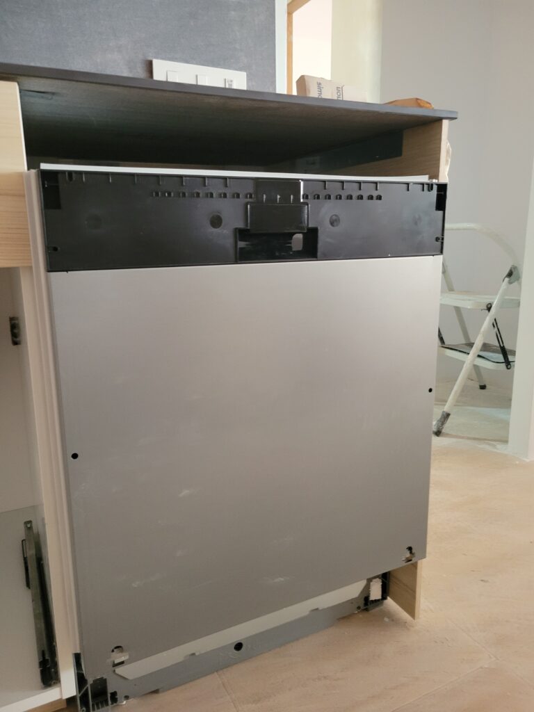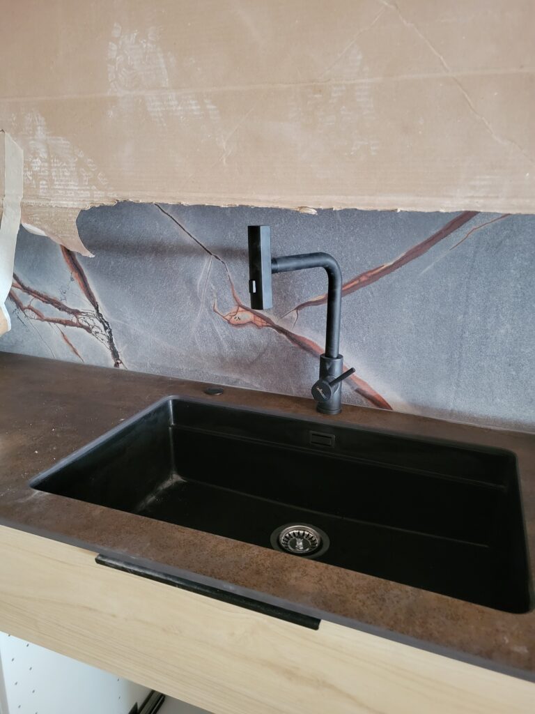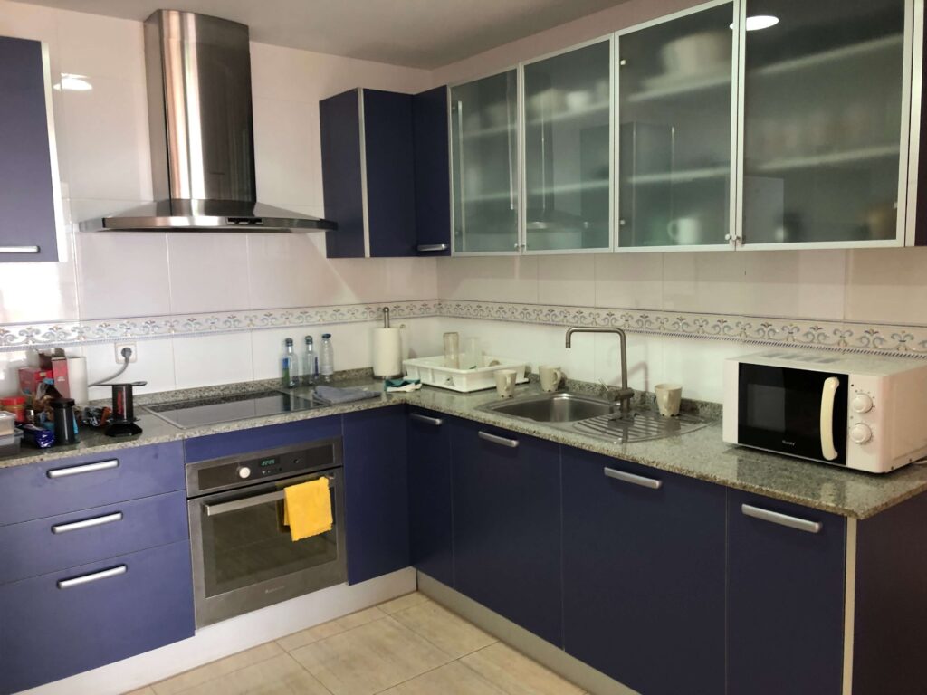 Stunning open & modern kitchen space – After removing the partition wall, this kitchen is now fully integrated into a bright, open-plan living area. The sleek, handleless black cabinets provide a contemporary & minimalist aesthetic, while elegant grey countertops offer ample workspace. Under-cabinet LED lighting brightens the space & highlights a striking marble backsplash with subtle gold nugget veining, adding a touch of luxury & sophistication. The redesigned layout enhances workflow & connectivity, making it perfect for cooking, entertaining, & enjoying coastal living in this Águilas retreat.